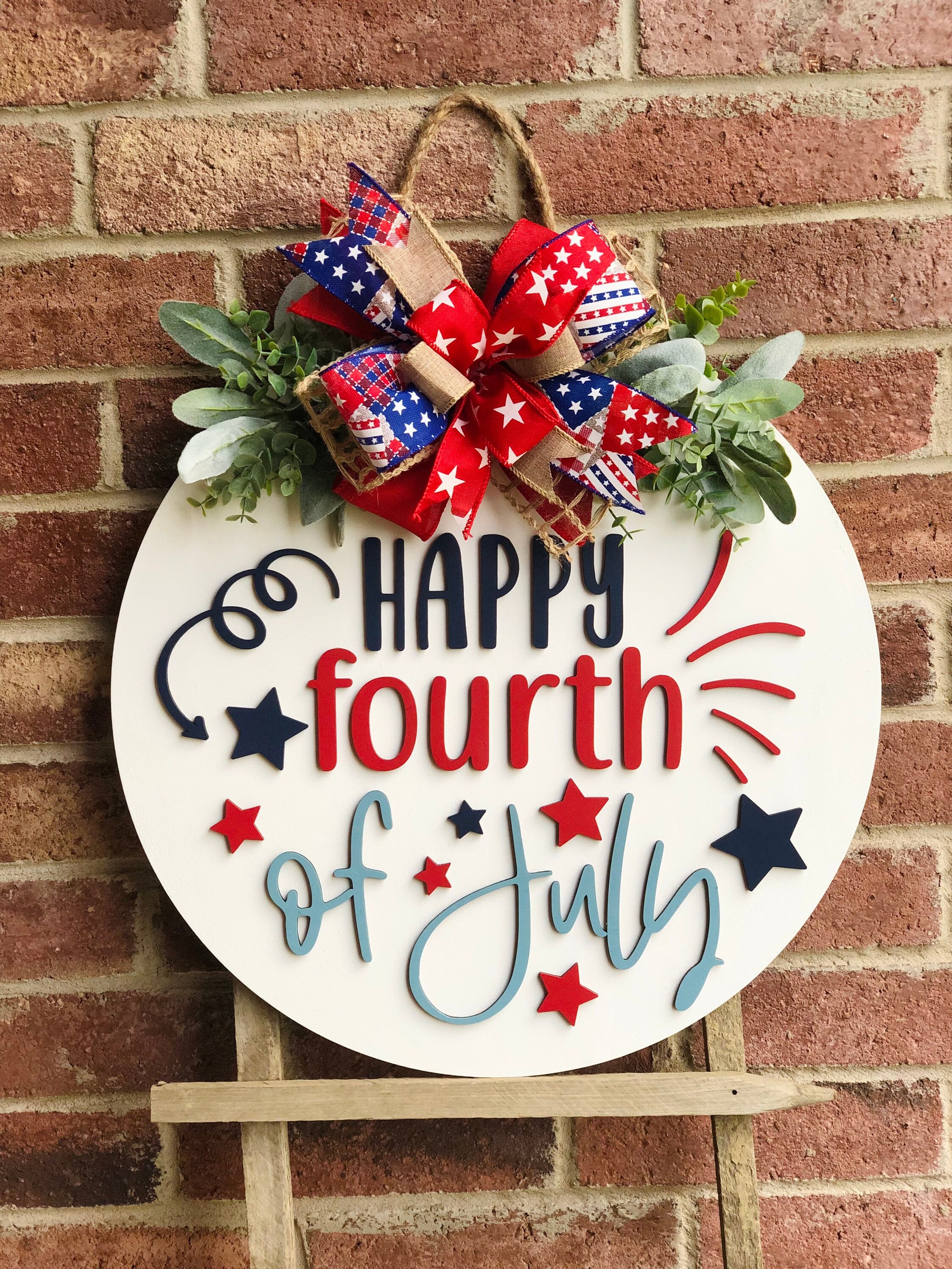 Each piece of wood is hand picked, hand cut, stained and/or painted. Faux greenery, bow and 3D raised wood lettering is included!